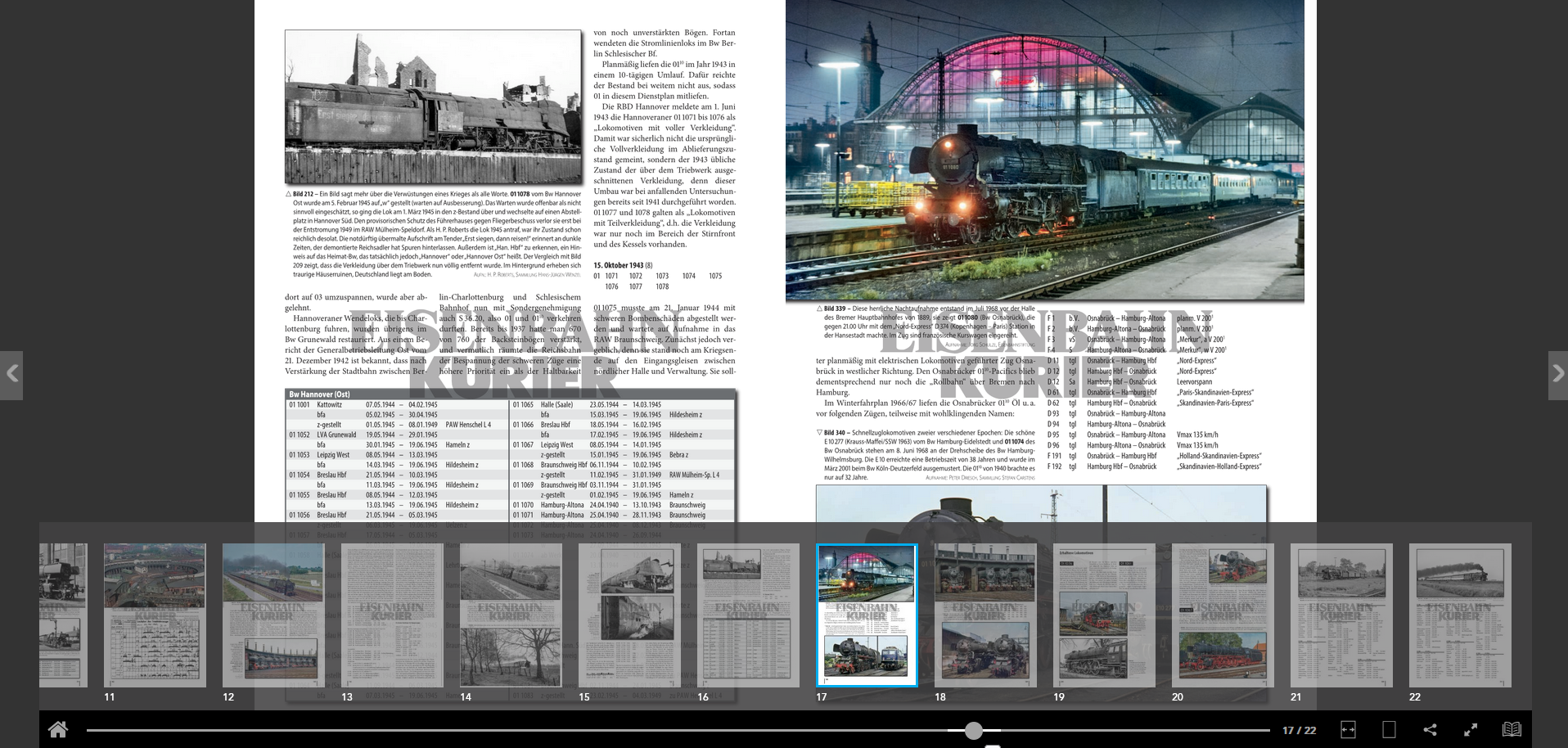 01.10 – die Baureihe steht bei Eisenbahnfreunden auch heute noch für die Faszination des Schnellzug-Dampfbetriebes auf höchstem Niveau: die stärkste deutsche Serien-Schnellzugdampflok, die höchsten Laufleistungen im deutschen und europäischen Maßstab und die schnellsten dampfbespannten Schnellzüge Europas! Dabei stand ihre Premiere 1939 unter keinem guten Stern: Die 01.10 konnten nur kurze Zeit in ihrem vorgesehenen Einsatzspektrum glänzen, dann sorgte der Zweite Weltkrieg für einen drastischen Niedergang der eleganten Stromlinienloks. Erst in den 1950er Jahren bei der Deutschen Bundesbahn entfaltete die Baureihe ihr maximales Leistungspotential und gelangte zu einzigartiger Blüte im Schnellzugdienst der DB: Ohne Stromlinienverkleidung, modernisiert und mit neuen Kesseln und teilweise Ölfeuerung ausgerüstet, erreichte die Baureihe 01.10 die höchsten monatlichen Laufleistungen deutscher Dampflokomotiven von bis zu 28.000 Kilometern. Dazu gehört aber auch die Feststellung, dass ihre herausragenden Leistungen mit zahlreichen Schäden und außergewöhnlich hohen Unterhaltungskosten erkauft wurden. Im Mai 1975 beendete die 01.10, jetzt als Baureihe 012 bezeichnet, beim Bw Rheine den Schnellzug-Dampfbetrieb bei der DB. Dem großen Faszinosum dieser Lokomotive entsprechend sind heute 9 Maschinen museal erhalten, davon zwei betriebsfähig.