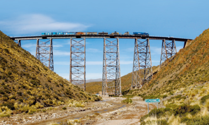 Die grenzüberschreitende Verbindung Salta – Antofogasta durchmisst den Andenkamm in Ost-West-Richtung von Argentinien nach Chile. Sie gehört zu den spektakulärsten Bahnen Südamerikas, ist noch auf kompletter Länge intakt, wird aber kaum noch befahren!