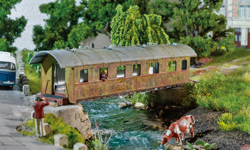 Gedeckte Brücken gibt es vor allem in schneereichen Gebieten. Auch dass ausrangierte Eisenbahnwagen als Brücke verwendet werden, kommt vor. Warum also nicht beides kombinieren und ein Motiv schaffen, das nicht auf jeder Anlage zu sehen ist ?